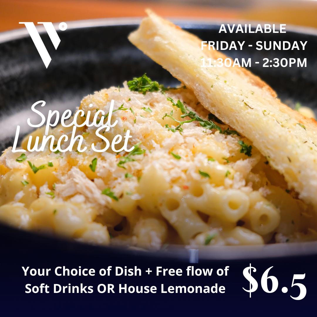 Savor our curated Lunch Set Menu and receive a complimentary House Lemonade or VBL soft drink with every order.